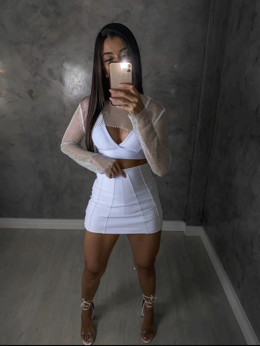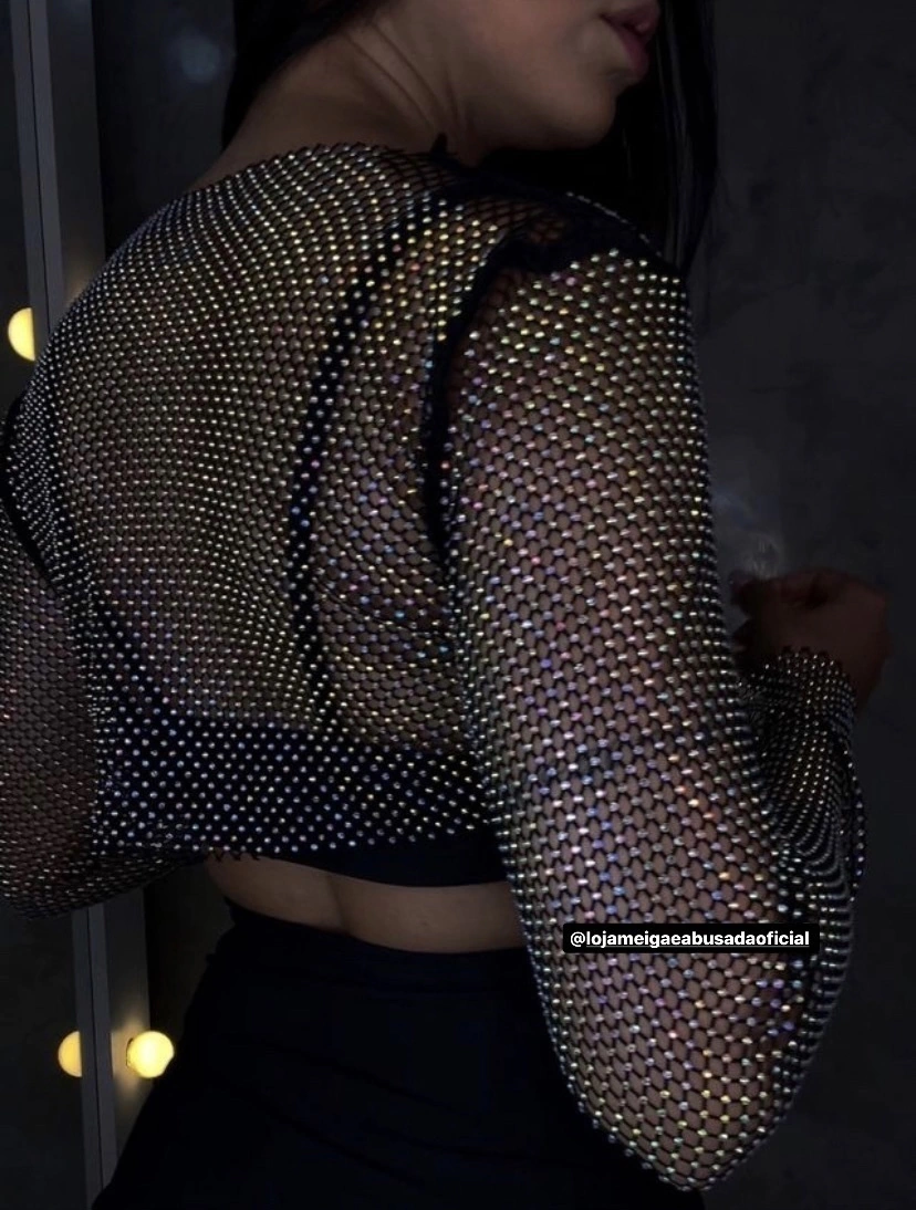 Um look com brilho perfeito para a noite. Cropped manga longa, confeccionado em tecido arrastão com aplicação em strass furta cor por toda a peça. *ACOMPANHA SOMENTE CROPPED ARRASTÃO, temos Croppeds em nosso site que podem ser utilizados por baixo, disponível a venda.* DICA: Use nosso Top BALLI ou Top Couro por baixo Recomendações: Lavar à mão e com sabão neutro. Não usar alvejante, não secar em secadora e nem passar com ferro. Tamanho Único: Veste do 36 ao 44 Modelo medido fora do corpo e sem esticar. Tamanho Comprimento Largura Manga Único 30cm 45cm 60cm