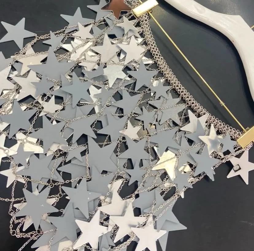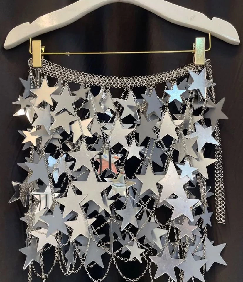 Saia de correntes com pingentes de estrelas em acrílico espelhado. Regulagem nas correntes Ideal para usar como sobreposição de shorts e saias. Todos os acrílicos possuem película protetora de riscos, retirar antes do uso para obter o efeito espelhado. Tamanho Único: Veste do 36 ao 44