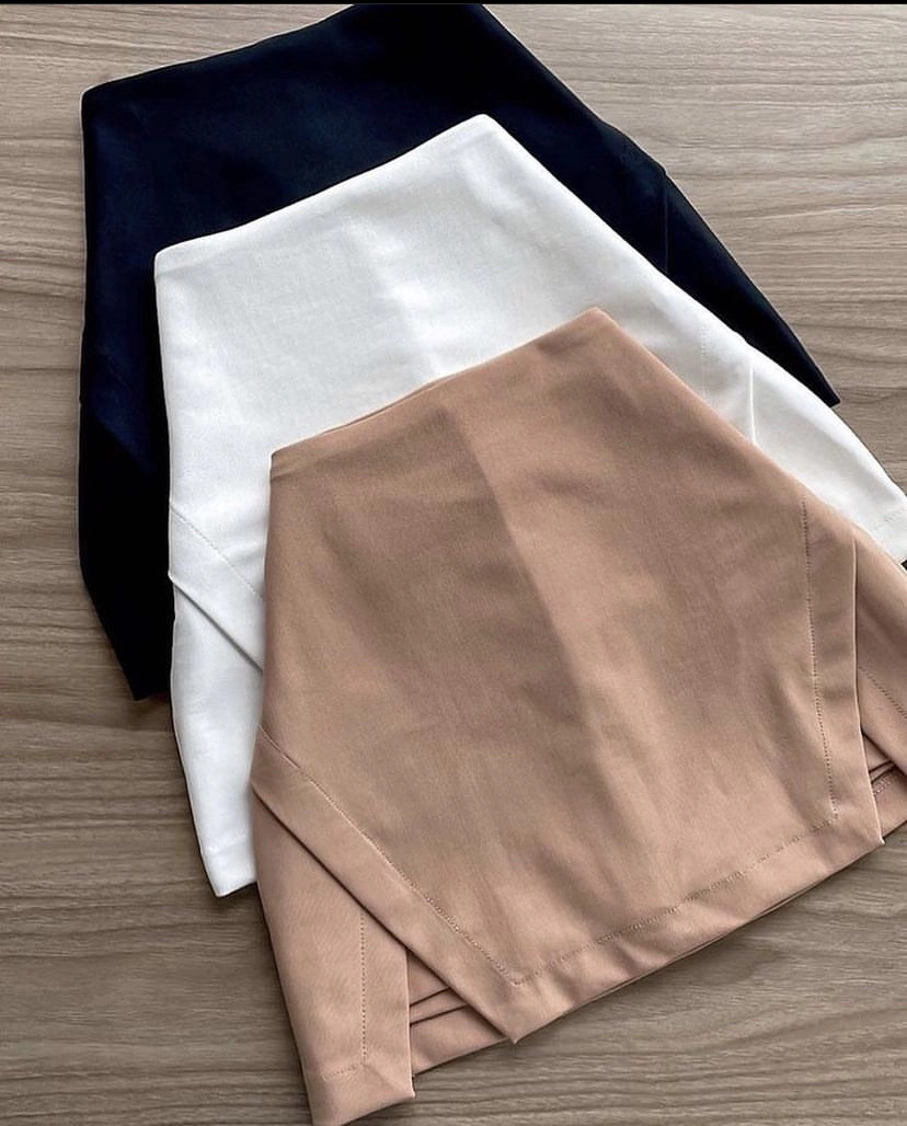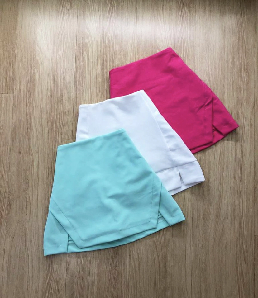 Saia na frente e na parte de trás, o shorts é por dentro. Tamanhos: P - 36 M - 38/40 G - 42 GG - 44